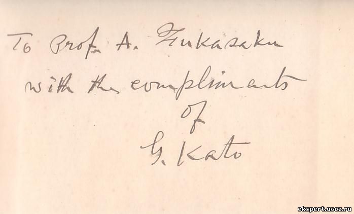 Автограф Като на книге "Синто, исследование религии японской нации" (1926). Собрание В.Э. Молодякова