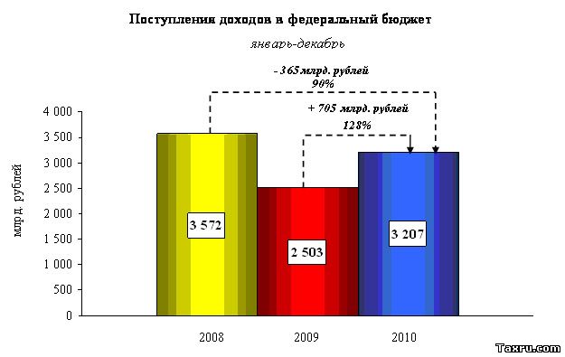 Всего в 2010 году в федеральный бюджет поступило 3 207,2 млрд. рублей, что на 28% больше, чем в 2009 году, а относительно уровня 2008 года поступления ниже на 10%.