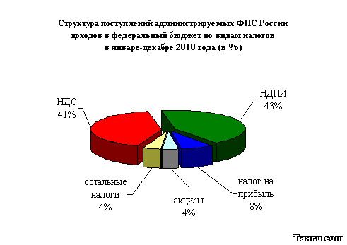 В общей сумме администрируемых ФНС России доходов федерального бюджета поступления налога на добычу полезных ископаемых составили 43%, НДС — 41% и налога на прибыль 8%.