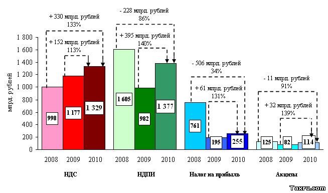 Налога на добавленную стоимость на товары (работы, услуги), реализуемые на территории Российской Федерации, в 2010 году поступило 1 328,7 млрд. рублей, что на 13% больше, чем в 2009 году, а относительно уровня 2008 года поступления выросли в 1,3 раза.