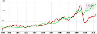 БАРРЕЛЬ, КАК МЕРИЛО ЖИЗНЕСПОСОБНОСТИ РФ Вторая причина "роста экономики" известна, без сомнения, всякому мало-мальски грамотному гражданину - рост доходов от продажи углеводородного топлива, вызвавший некоторое оживление экономики. Но оживление оживлению рознь. Если экспорт нефти и вызвал оживление производства, то исключительно в областях, обслуживающих ТЭК. И наоборот, отрасли, не связанные с экспортом, стремительно загибались - например, гражданское авиастроение (за все годы путинизма-медведизма под шумок разговоров о модернизации и высоких технологиях произведено аж целых 5 устаревших Ту-154). А вот видимая часть "роста экономики" - не совсем рост экономики. Правильнее назвать это ростом потребления. То есть нефтедоллары при Путине вовсе не инвестировались в экономику, ТЭК не стал локомотивом, вытаскивающим народное хозяйство страны из той выгребной ямы, куда его запинали реформаторы. Свалившиеся на голову подобно манне небесной сверхдоходы просто тупо разворовывались или сливались на потребительский рынок. Чем был вызван бешенный рост цен на недвижимость во второй половине 2000-х? Да просто нефтедоллары в РФ было НЕКУДА ВКЛАДЫВАТЬ, вот на рынке и стали надуваться пузыри (биржевые спекуляции, недвижимость, земля, потребительское кредитование), поглощавшие свободные капиталы. Кризис, как ни странно, не вызвал значительного падения цен на недвижимость в соответствие с классическим постулатом о равновесии спроса и предложения. Вместо этого лишь многократно снизились объемы строительства, а колоссальное количество незавершенных объектов оказались замороженными. Теперь весьма интересный вопрос - каким же образом ТЭК смог стать денежным насосом. Судя по приведенному графику нефтяные цены не так чтобы уж очень радикально подскочили - со средневзвешенных $16 за баррель при Ельцине до средних $40 в путинское десятилетие. Годовая средневзвешенная цена нефти даже немного падала в 2002 г. К тому же следует учитывать, что номинальное повышение цены барреля в долларах вызвано девальвацией, то есть если считать цену нефти, например, в золоте (корреляция между долларовой ценой нефти и курсом доллара к золоту показана зеленым цветом), то лишь временами рост стоимости нефти опережал дорожающее золото. Таким образом мы приходим к выводу, что получить ударную дозу валютных доходов РФ могла не столько за счет роста нефтяных цен, сколько за счет увеличения экспорта. Так ли это? Да, это так (см график ниже). Вот мы и подошли к самому интересному вопросу - каким образом была увеличена добыча нефти в РФ? Месторождения Западной Сибири с конца 80-х находятся в стадии падающей добычи (пик пройден в 1987 г.), приволжские промыслы - тем паче. Месторождения Восточной Сибири по большому счету не осваиваются - слишком дорого, да и инвестиционных капиталов для этого нет (куда деваются сверхдоходы сказано выше). Сахалинский шельф благополучно подарили западным компаниям при Ельцине на кабальных условиях - теоретически РФ что-то получит с этого только тогда, когда инвесторы "отобьют" свои затраты, но практически это светлое время так же недосягаемо, как линия горизонта. В 2010 г. началась промышленная добыча разве что на шельфе Северного Каспия, но если честно, лучше бы ее не начинали, ибо рыба начала массово дохнуть еще на стадии разведочного бурения (нефтяники о