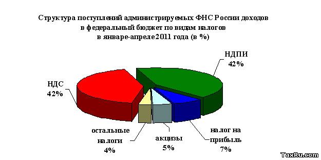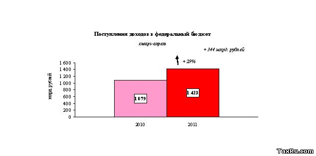 В апреле 2011 года в федеральный бюджет по предварительным данным поступило администрируемых ФНС России доходов в сумме 412 млрд. рублей – на 61% больше, чем в апреле 2010 года. За январь-апрель 2011 года по сравнению с январем-апрелем 2010 года поступления выросли на 29%.
