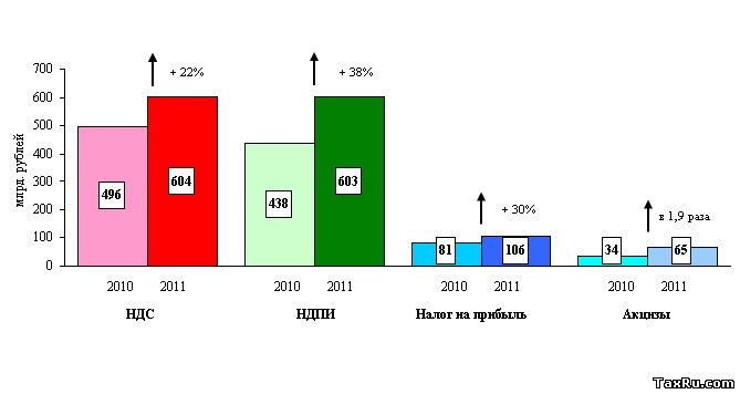 Поступления налога на прибыль организаций в апреле 2011 года составили 39 млрд. рублей, или на 12% больше, чем в апреле 2010 года. За январь-апрель 2011 года по сравнению с январем-апрелем 2010 года поступления выросли на 30%.