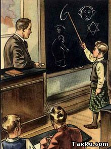 Сегодня в седьмом классе царит оживление: любимый учитель, герр Биркманн, говорит о евреях. Даже самый ленивый мальчик, Эмиль-храпун, не спит и внимательно слушает. Герр Биркманн знает о евреях из жизни и умеет излагать эти знания в доступной форме, поэтому любимое время детей – «еврейский час». Подходит момент, когда надо проверить, что выучили дети. Тянутся руки. Как мы узнаем еврея? «Мы можем узнать его по форме носа: он загибается на самом кончике и похож на цифру шесть. Мы так и называем этот признак – «еврейская шестерка». Он отличается от просто горбатого или орлиного носа тем, что похож именно на шестерку, — отвечают ученики. Мы можем его опознать и по губам – они обычно мясистые. И глаза его отличаются от наших – веки у них тяжелые, взгляд подозрительный и пронизывающий, сразу видно лживого человека. Ростом они невелики, от среднего до низкого, страдают плоскостопием, уши у них большие и торчат, как ручка у чашки. Волосы черные и курчавые, как у негра, а при разговоре они машут руками». В конце урока дети дружно поют звонкими голосами: «С еврейского лица на нас смотрит сам дьявол» и радостно разбегаются.