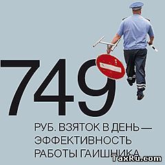 По статистике ГИББД, в 2010 году инспекторы составили 47 млн протоколов за нарушение правил дорожного движения, а сумма штрафов, по данным Росказны, достигла 8,89 млрд руб. Размер среднего дорожного штрафа получается равным 189 руб., что соответствует таким нарушениям ПДД, как непропускание трамвая на перекрестке или парковка на местах для инвалидов (200 руб.). По заказу Минэкономразвития ФОМ провел в 2011 году исследование и выяснил, что в 2010-м инспекторы взяли на дорогах 9,7 млн взяток в среднем по 2495 руб. каждая на общую сумму 24,2 млрд руб. Если эти цифры верны, то выходит, что за нарушение ПДД гаишники наказывают штрафом примерно в 5 раз чаще, чем взяткой, однако размер взятки в 13,2 раза больше штрафа. Иными словами, каждый контакт гаишника и водителя на 83% состоит из штрафа и на 17% из взятки. Если же сложить количество штрафов и взяток, то окажется, что каждый из 48 млн обладающих водительскими удостоверениями россиян попадается гаишникам в среднем 1,2 раза в год. При нынешней штатной численности ГИБДД 130 тыс. инспекторов каждый из них ловит по 436 водителей в год, или по 1,8 в день (как правило, в году 249 рабочих дней). А так как в этом показателе содержится 1,5 штрафа и 0,3 взятки, то каждую смену гаишник кладет в карман государства 284 руб., а в свой — 749 руб.