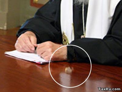 на руке иерарха нет часов, но при этом они отражаются на лакированном