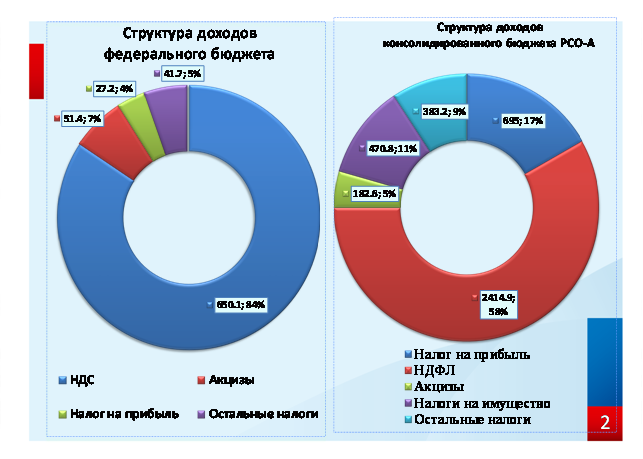 В структуре доходов федерального бюджета основная доля формируется за счет поступлений налога на добавленную стоимость – 84,4% и акцизов по подакцизным товарам – 6,7%.