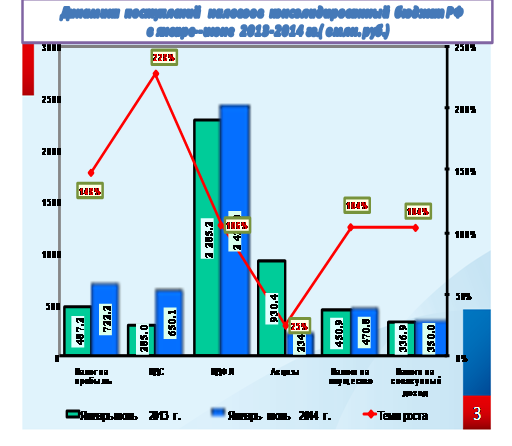 Динамика поступлений основных налогов в консолидированный бюджет Российской Федерации в январе-июне 2013–2014 гг. приведена на слайде.