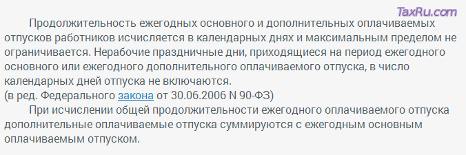 Согласно ст. 120 Трудового кодекса РФ нерабочие праздничные дни, приходящиеся на период ежегодного основного или ежегодного дополнительного оплачиваемого отпуска, в число календарных дней отпуска не включаются.