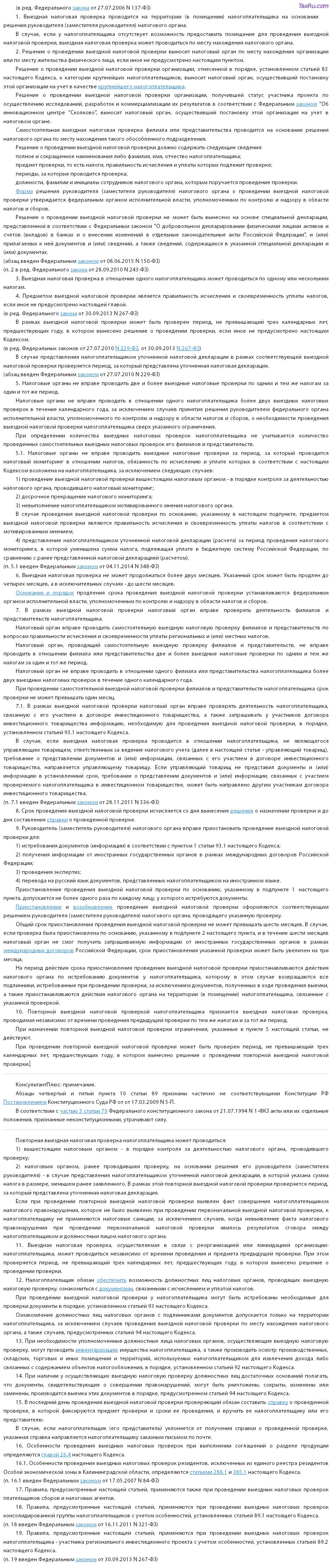 В статье 89 НК РФ по тем же основаниям запрещено проводить выездную налоговую проверку. Статьей 102 НК РФ сведения, содержащиеся в специальной декларации, отнесены к налоговой тайне. Разглашение таких сведений и утрата представленных специальных деклараций и прилагаемых к ним документов являются основанием для привлечения виновных лиц к уголовной ответственности за незаконное разглашение сведений, составляющих налоговую тайну, в соответствии с Уголовным кодексом РФ.