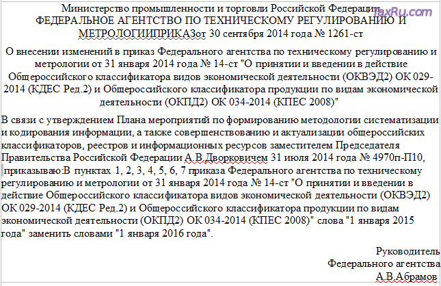 - ОКВЭД2 и ОКПД2 в соответствии с Приказом Росстандарта от 10.11.2015 №1745-ст «О внесении изменений в приказ Федерального агентства по техническому регулированию и метрологии от 31 января 2014 г. № 14-ст «О принятии и введении в действие Общероссийского классификатора видов экономической деятельности (ОКВЭД2) ОК 029-2014 (КДЕС Ред. 2) и Общероссийского классификатора продукции по видам экономической деятельности (ОКПД2) ОК 034-2014 (КПЕС 2008)»;