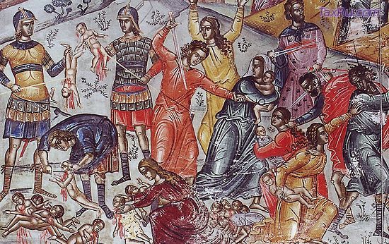 Когда царь Ирод осознал, что был обманут волхвами, не показавшими ему путь к тому месту, где находился новорожденный Спаситель и Царь, он в ярости приказал воинам истребить в Вифлееме и его окрестностях всех младенцев мужского пола, которым не исполнилось еще двух лет. Царь был весьма встревожен появлением на свет Младенца, Чье рождение было предвозвещено столь необыкновенными знамениями и поклониться Которому поспешили такие знатные особы. Ирод счел, что Он будет представлять угрозу его собственной власти, поэтому не колеблясь обрек на смерть множество невинных душ, лишь бы в их числе умертвить Младенца Христа. Царь повелел убить всех детей[1], рожденных с момента первого появления Вифлеемской звезды, о чем он узнал из рассказа волхвов.