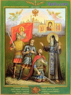 Икона «Благословление преподобным Иринархом-Затворником Борисо-Глебским – Православного русского воинства, народных героев-вождей и спасителей Отечества – Козьмы Минина и Димитрия Пожарского в 1612 году»