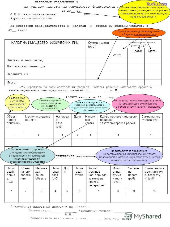 Если в этих случаях имелась переплата по имущественным налогам за предшествующие периоды, то в налоговом уведомлении итоговая сумма налогов будет выставлена с учетом этой переплаты.