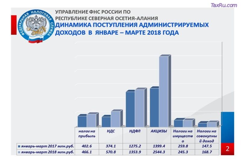 Поступления акцизов по подакцизным товарам в консолидированный бюджет Российской Федерации в январе – марте2018 года составили 2544,3 млн. рублей. Темп роста поступлений по сравнению с 1 кварталом 2017 года составил 181,8 процент.
