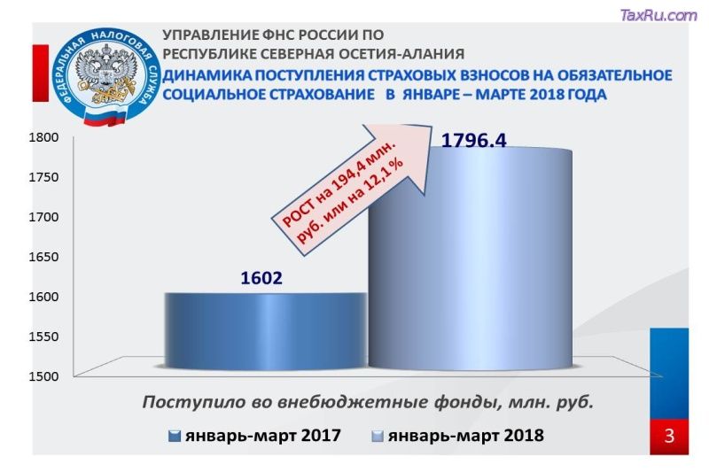 Рост поступлений по страховым взносам на обязательное социальное страхование по сравнению с аналогичным периодом 2017 года составил 12,1 % или на 194,4 млн.руб. больше.