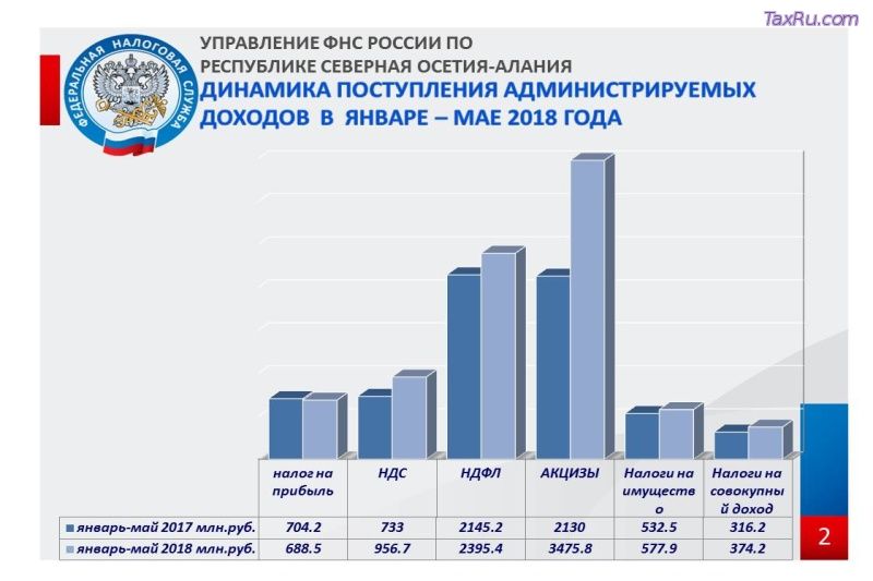 В консолидированный бюджет Республики Северная Осетия – Алания за январь – май 2018 года поступило 5964,8 млн. рублей, что на 1043,7 млн.рублей или на 21,2 % больше поступлений аналогичного периода прошлого года. Доходы республиканского бюджета составили 3090,6 млн. рублей и выросли по сравнению с январем – маем 2017 года на 7,4 %. В доход муниципальных образований мобилизовано 1341,7 млн. рублей с темпом роста 112,1 процентов.