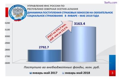 Рост поступлений по страховым взносам на обязательное социальное страхование по сравнению с аналогичным периодом 2017 года составил 13,3 % или на 370,7 млн.руб. больше.