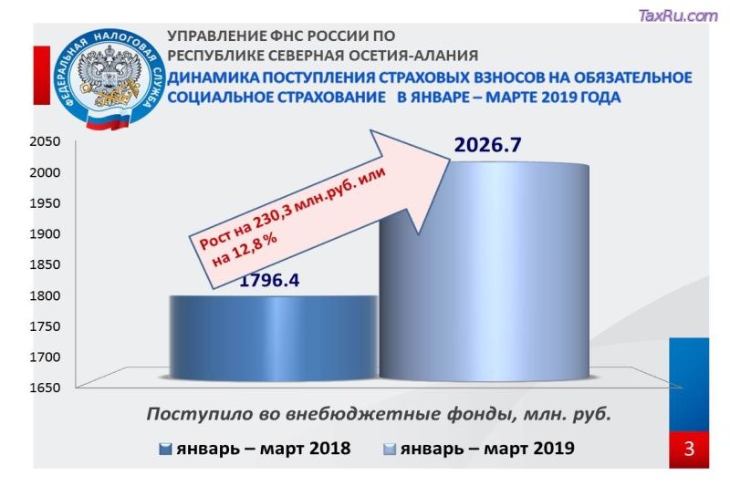 В январе – марте 2019 года поступило страховых взносов на обязательное социальное страхование, администрируемых налоговыми органами в объеме 2026,7 млн.руб., в том числе в бюджет:
