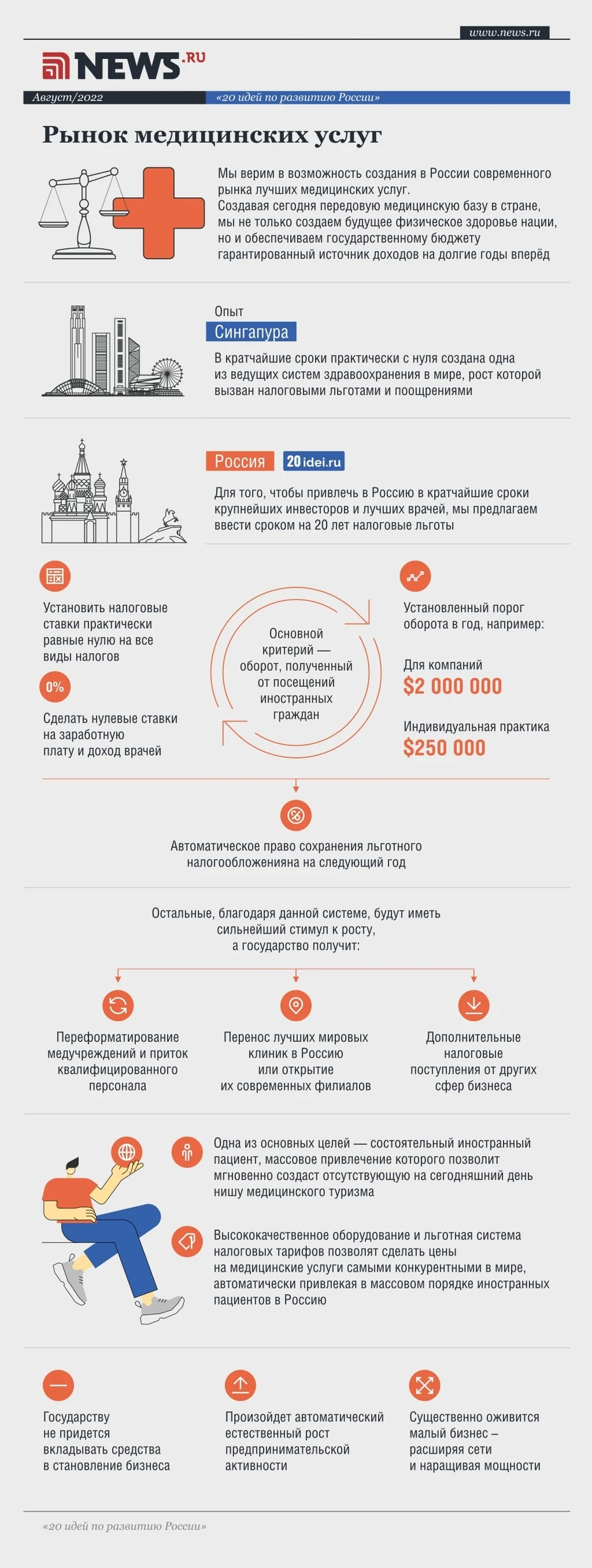 В России можно создать лучшую систему здравоохранения в мире. Для этого необходимо привлечь в отрасль крупнейших медицинских инвесторов и лучших врачей. Чтобы этого добиться, для них необходимы максимально выгодные условия работы. В первую очередь — налоговые льготы. Медицинские услуги, оказываемые в России, должны стать дешевле аналогичных, предоставляемых в лучших ведущих клиниках мира.