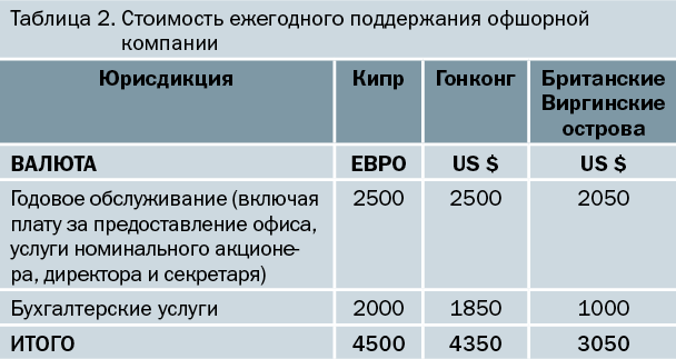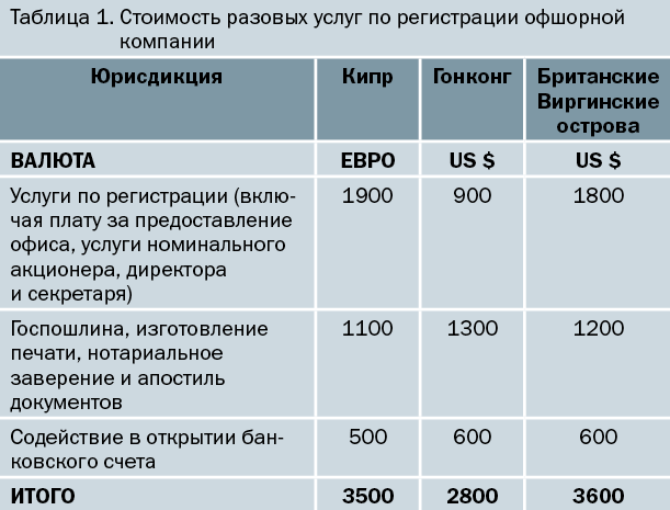 Регистрация офшорной компании обходится дороже, чем регистрация юридического лица в РФ. Как правило, при регистрации собственник оплачивает регистрационные сборы, подготовку, нотариальное заверение и апостиль документов, а также услуги регистратора. При желании компания-регистратор за отдельную плату оказывает поддержку при открытии счета в банке. Приблизительная стоимость разовых услуг по регистрации офшорной компании в различных юрисдикциях представлена в таблице 1. Дальнейшие расходы по содержанию компании возникают, начиная со второго года ее существования. Они складываются из платы регистратору за годовое обслуживание (включая правительственные пошлины, зарегистрированный офис, услуги номинальных акционера, директора и секретаря) и стоимости бухгалтерских услуг.