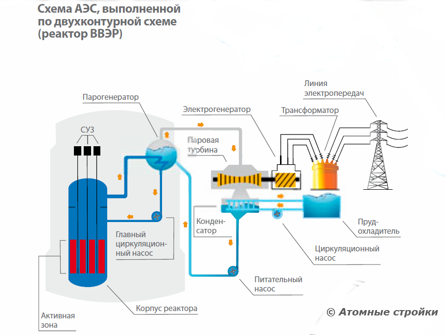 Используется двухконтурная схема генерации пара. И применен реактор под