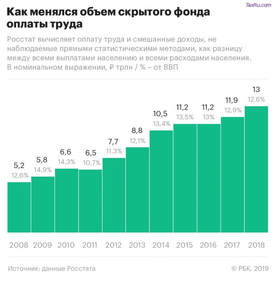 По данным Росстата, скрытый фонд оплаты труда в 2018 году составил более 13 трлн руб. (12,6% ВВП). Сюда входят зарплаты в конвертах в официальном секторе (когда часть заработка выдается сотруднику мимо кассы), зарплаты у индивидуальных предпринимателей и физлиц, а также доходы самозанятых. Сокращение доли скрытых зарплат в ВВП наблюдается каждый год с 2014–2015 годов, но в разные годы фиксировалась и меньшая доля серых зарплат (см. инфографику).
