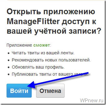 4. В следующем окне нажимаете на кнопку "Войти”, чтобы разрешить сервису ManageFlitter доступ к твиттер аккаунту: