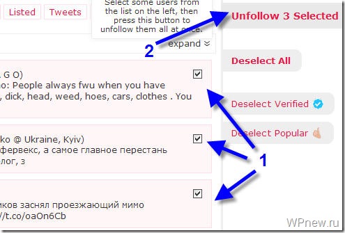 6. Теперь во вкладке "Not Following Back” Вы можете увидеть список людей, на которые Вы подписаны, но они не подписались на Вас в ответ, от таких некоторых людей я отписываюсь. Чтобы отписаться, проставьте напротив каждого аккаунта галочки и нажмите на кнопку "Unfollow Selected”: