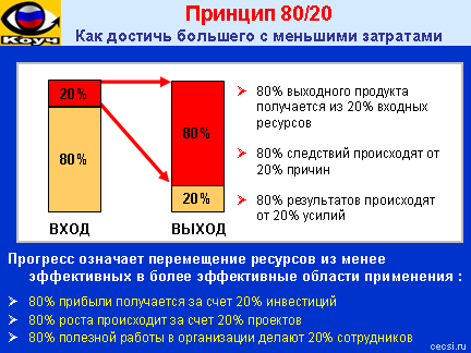 «Принцип Парето»: примерно 20% усилий и времени достаточно, чтобы получить 80% результата. Находя возможности принять «реальный» результат вместо «идеального», Вы можете сэкономить значительные ресурсы для других дел. В каких областях может применяться принцип Парето?