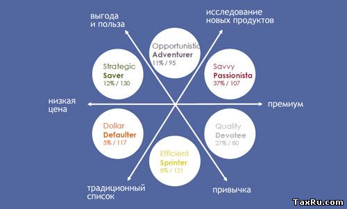 Все эти типы покупателей представлены как на Западе, так и в России. По потребительскому складу россиянам ближе всего французы. Они так же, как и мы, в большинстве своем - "в меру увлекающиеся покупатели" и "приверженцы качества". При этом такие типы как "экономные покупатели" и "мотивированные только ценой" наиболее распространены в США и Великобритании. В процентном соотношении это выглядит так: