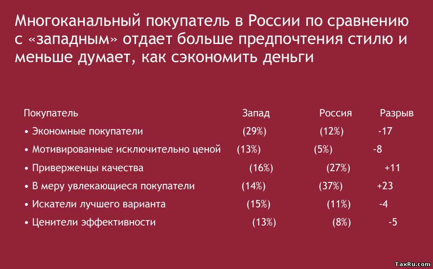 Согласно опросу, проведенному недавно Leo Burnett и Art Worldwide, 86% россиян приобретают товары, используя в среднем 5 каналов, и тратят на шопинг в 2 раза больше времени, чем американцы и европейцы. Кроме того, в России любят все новое, трендовое и не жалеют денег на эксперименты (да, мы - такие!).