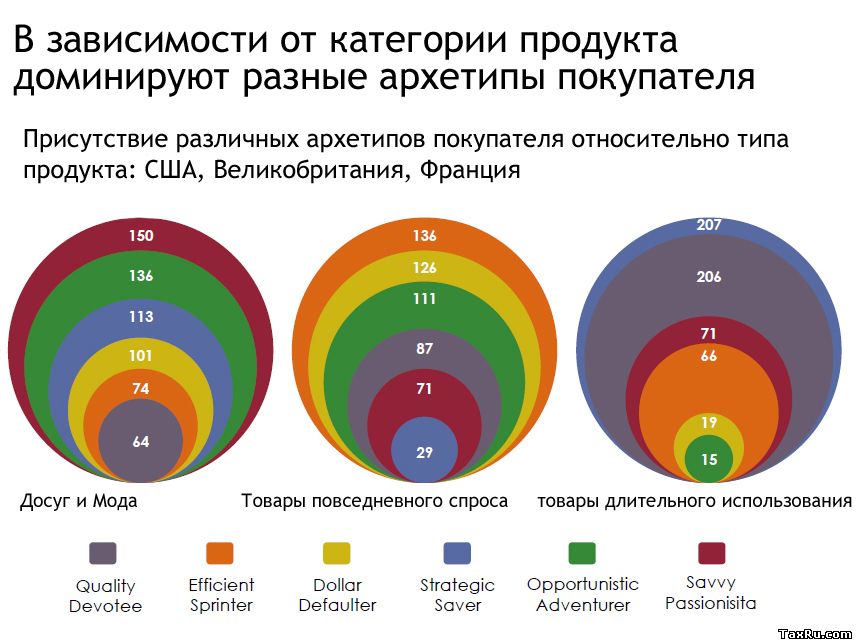 Исследование выявило прямую зависимость между типом покупателей и категорией товара. В России при покупке товаров повседневного спроса потребители чаще ведут себя как "мотивированные только ценой", "ценители эффективности" и "в меру увлекающиеся". А при покупке товаров длительного пользования - как "экономные покупатели", "приверженцы качества" и "искатели лучшего варианта".